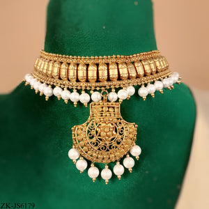Handcrafted 22k gold plated necklace alongside earrings adorned with pearls.