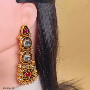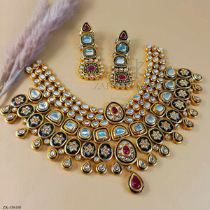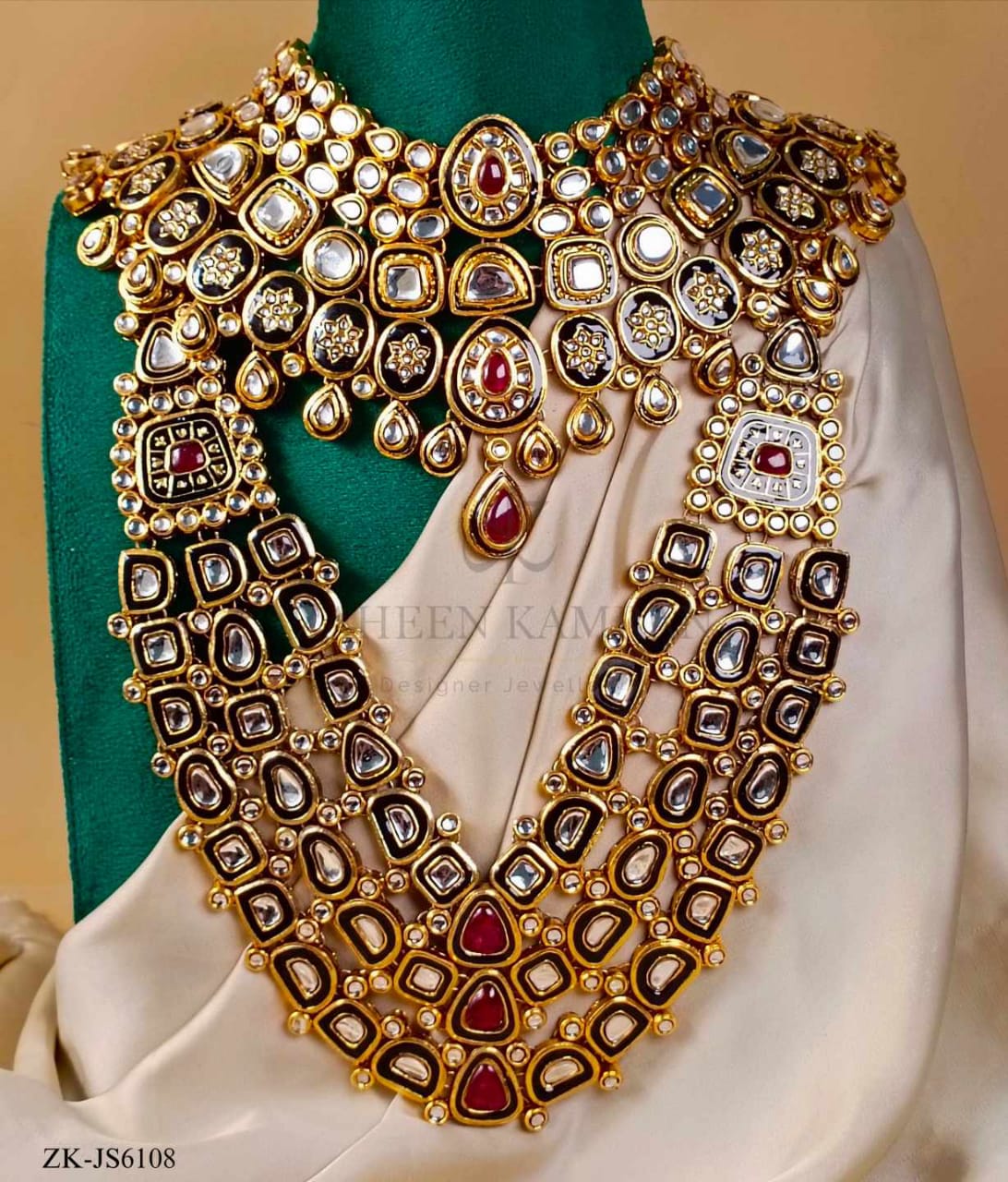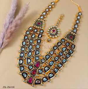Handcrafted 22k gold plated mala, necklace alongside earrings and tikka studded with ruby, kundan and blue meena.