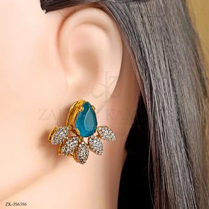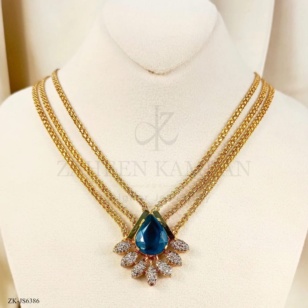 Handcrafted 22k gold plated mala alongside earrings studded with aqua stones and zircons.