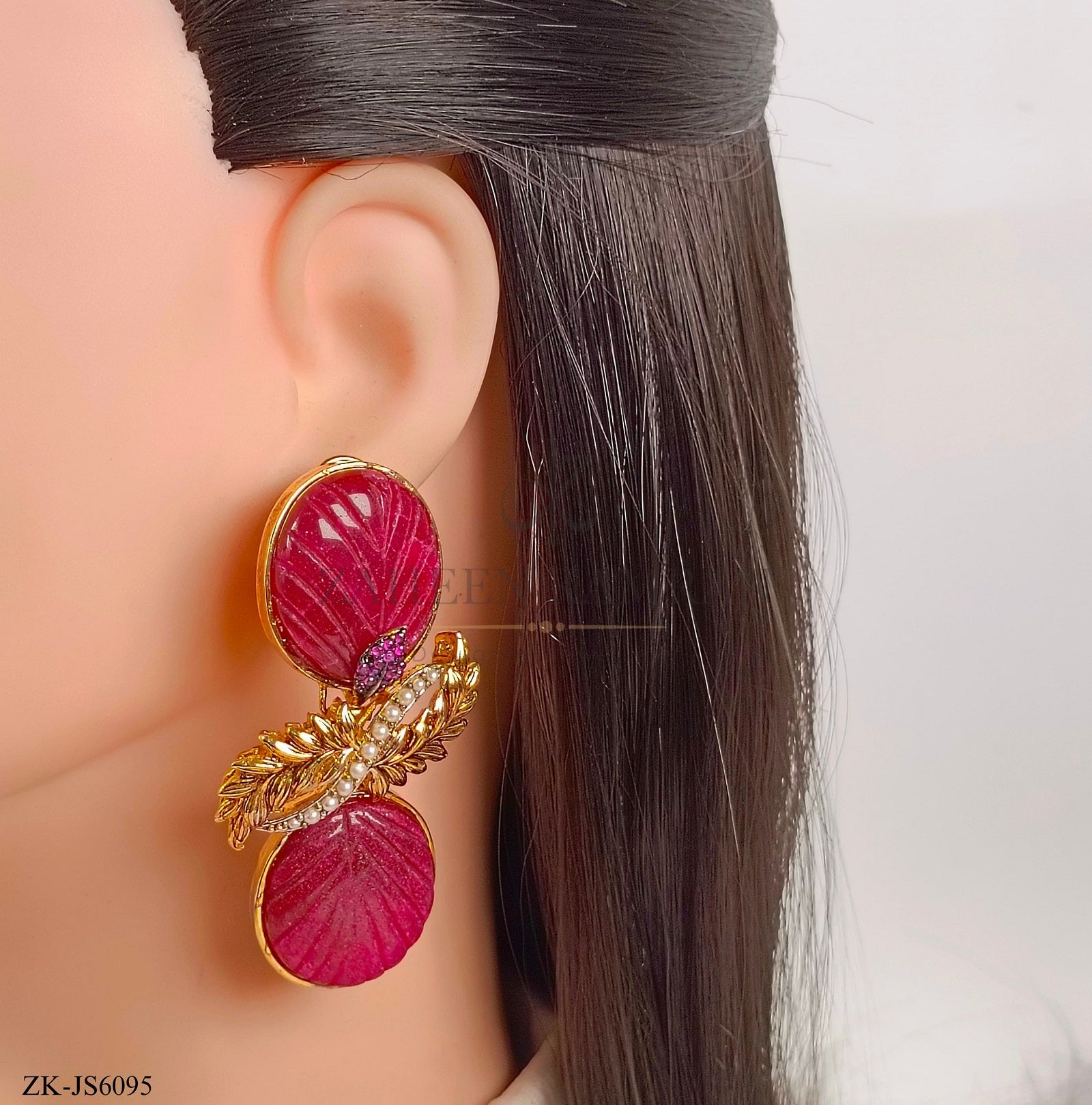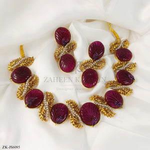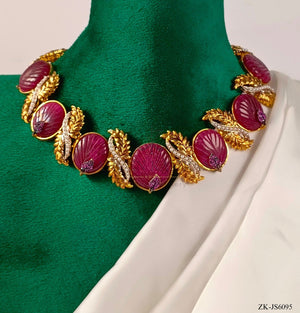 Handcrafted 22k gold plated choker alongside earrings studded with garnet and pearls.