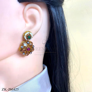 Handcrafted 22k gold plated mala alongside earrings studded with pink zirconia, champagne and smoky stones and