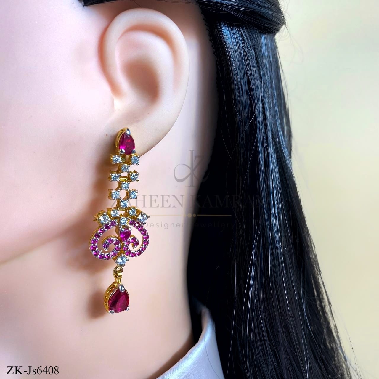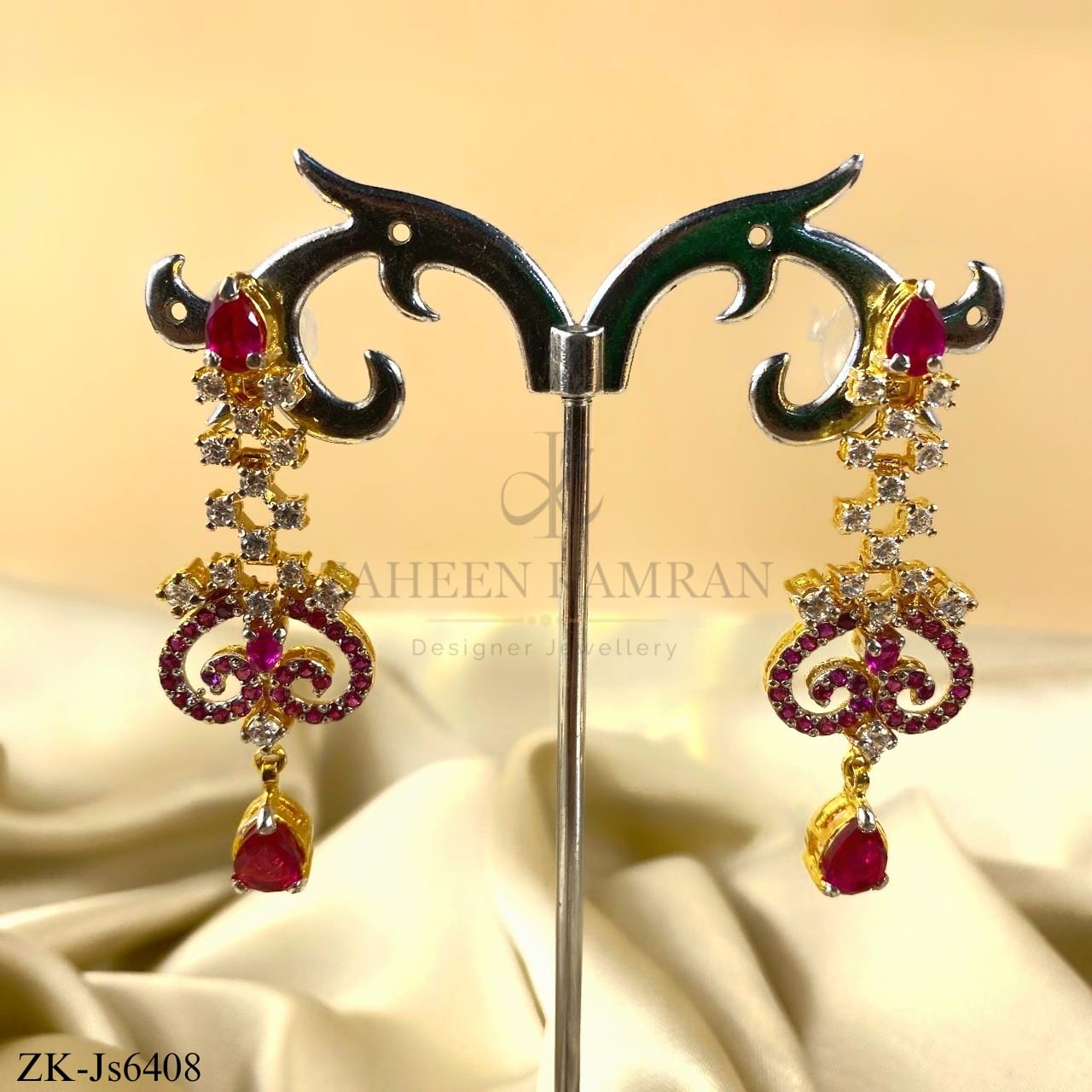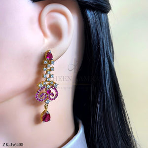 Handcrafted 22k gold plated necklace alongside earrings studded with pink zirconia and zircons.