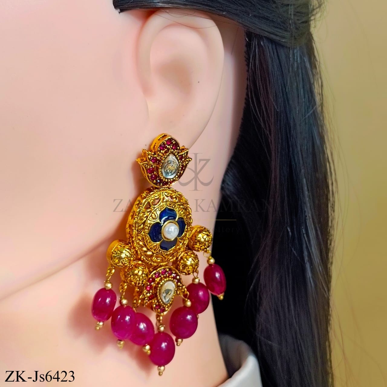 Handcrafted 22k gold plated necklace alongside earrings and tikka studded with pink zirconia, kundan and blue meena.