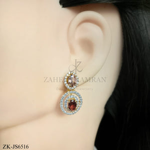 Handcrafted 22k gold plated necklace alongside earrings adorned with ruby, coffee stones and zircons.