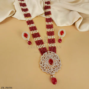 Elegant ruby and zircons beaded long necklace set with a large diamond-encrusted pendant featuring a central ruby and matching earrings.