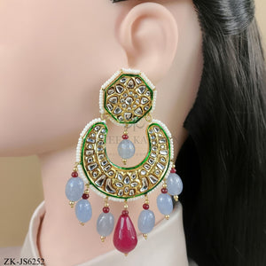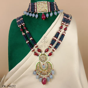 Handcrafted 22k gold plated choker, mala alongside earrings adorned with sapphire, garnet, kundan and pearls.