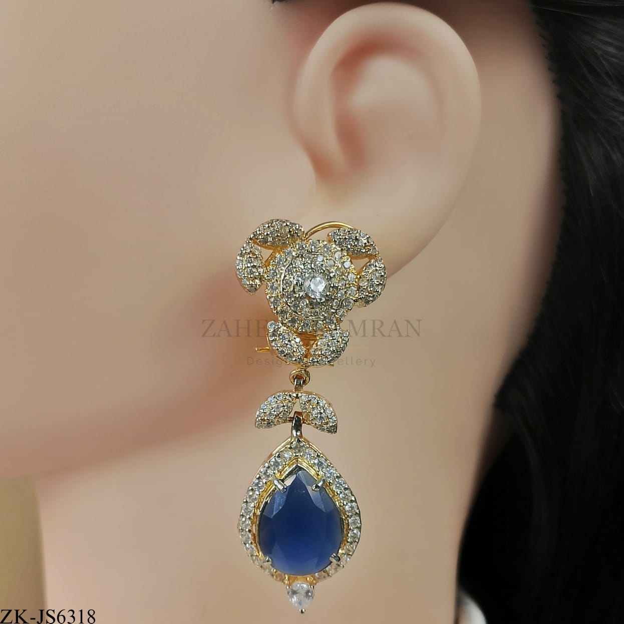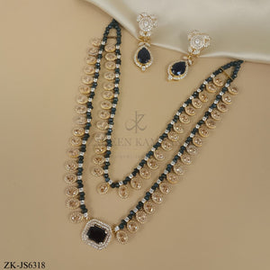Handcrafted 22k gold plated mala alongside earrings adorned with sapphire, champagne and zircons.