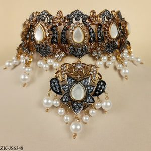 Handcrafted 22k gold plated choker alongside earrings adorned with zircons, smoky stones, white opals and pearls.
