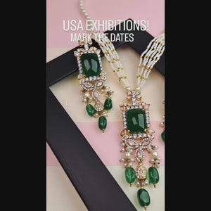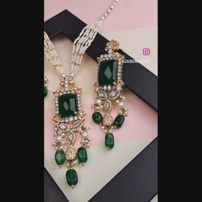 Handcrafted 22k gold plated necklace along earrings studded with emeralds and zircons.
