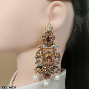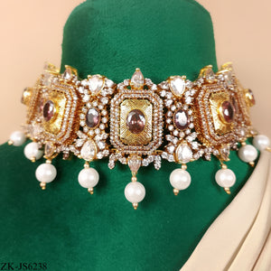 Handcrafted 22k gold plated choker alongside earrings and tikka adorned with coffee stones, Sheesh, zircons and pearls.