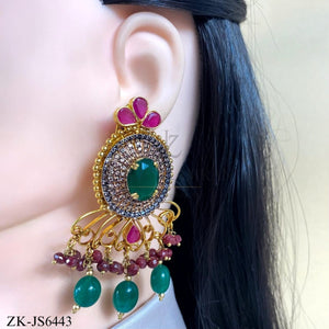 Handcrafted 22k gold plated necklace alongside earrings and tikka studded with emerald, pink zirconia, smoky and coffee stones.