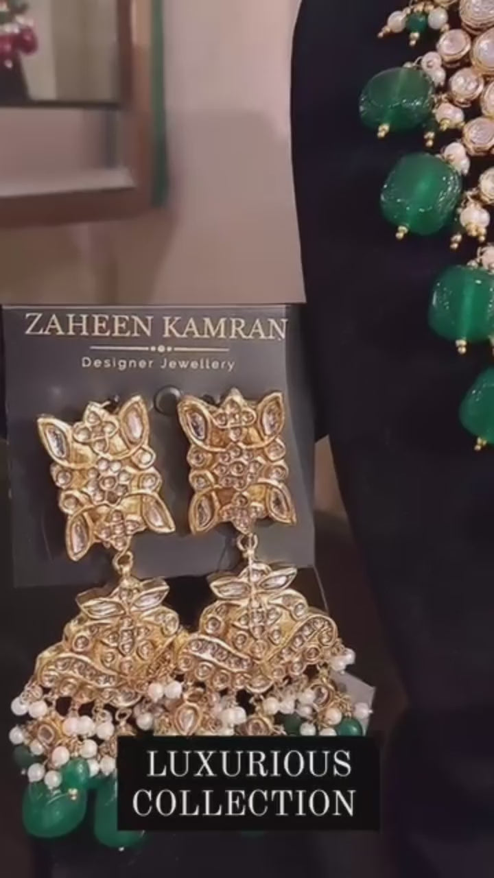 Handcrafted 22k gold plated choker along with earrings adorned with kundan, emeralds and pearls.