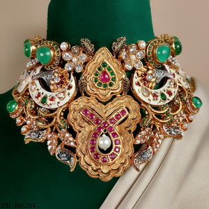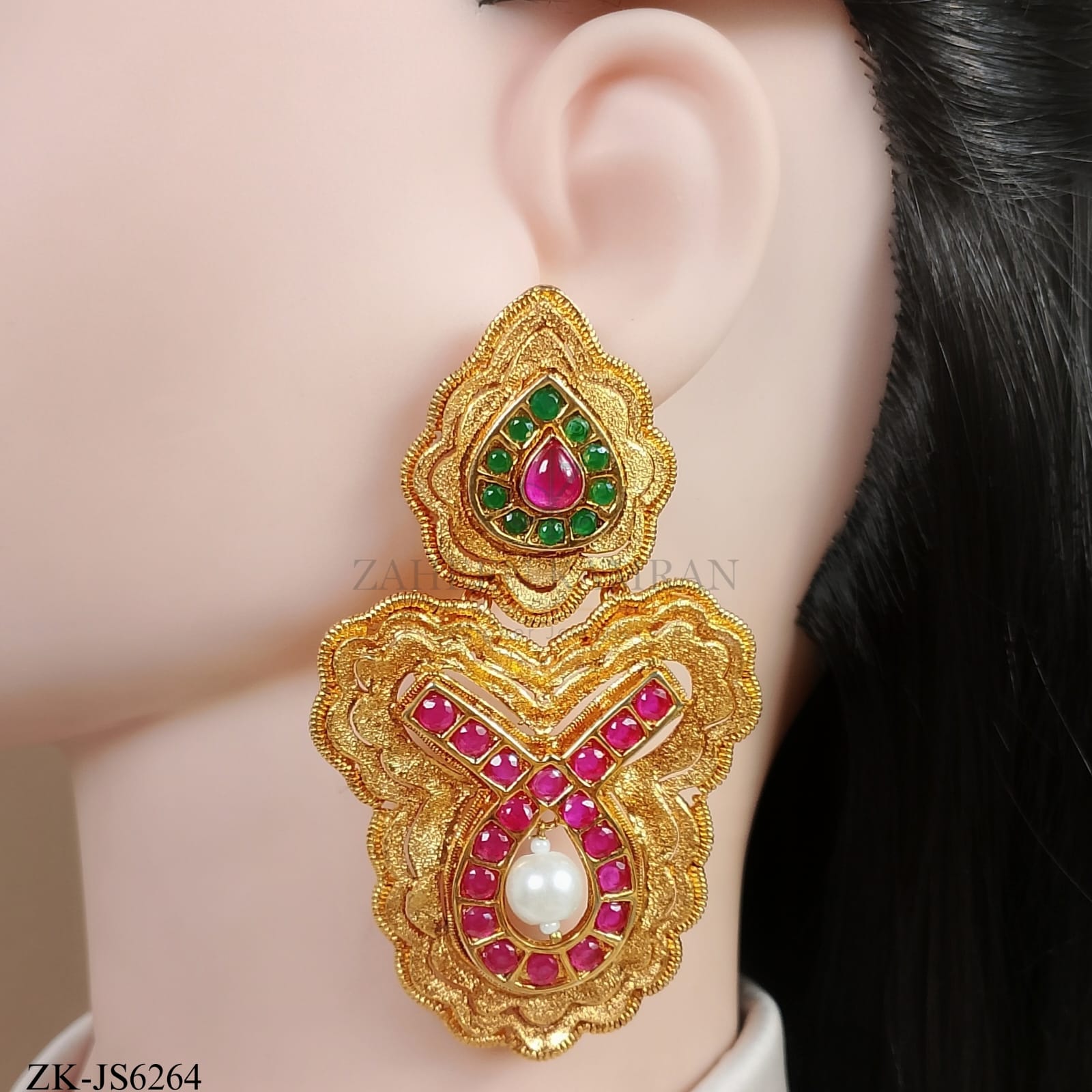 Handcrafted 22k gold plated necklace alongside earrings adorned with ruby, emerald, zircons and white Meena.