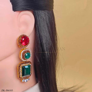 Handcrafted 22k gold plated mala alongside earrings studded with ruby, emerald and zircons.