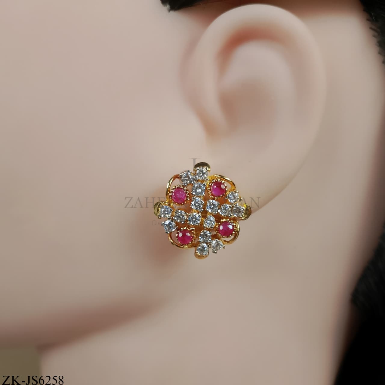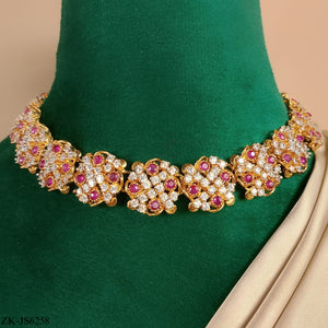 Handcrafted 22k gold plated necklace alongside earrings adorned with ruby and zircons.