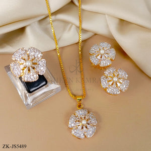 Handcrafted 22k gold plated pendant and earrings and ring adorned with zircons and cut stones.