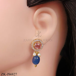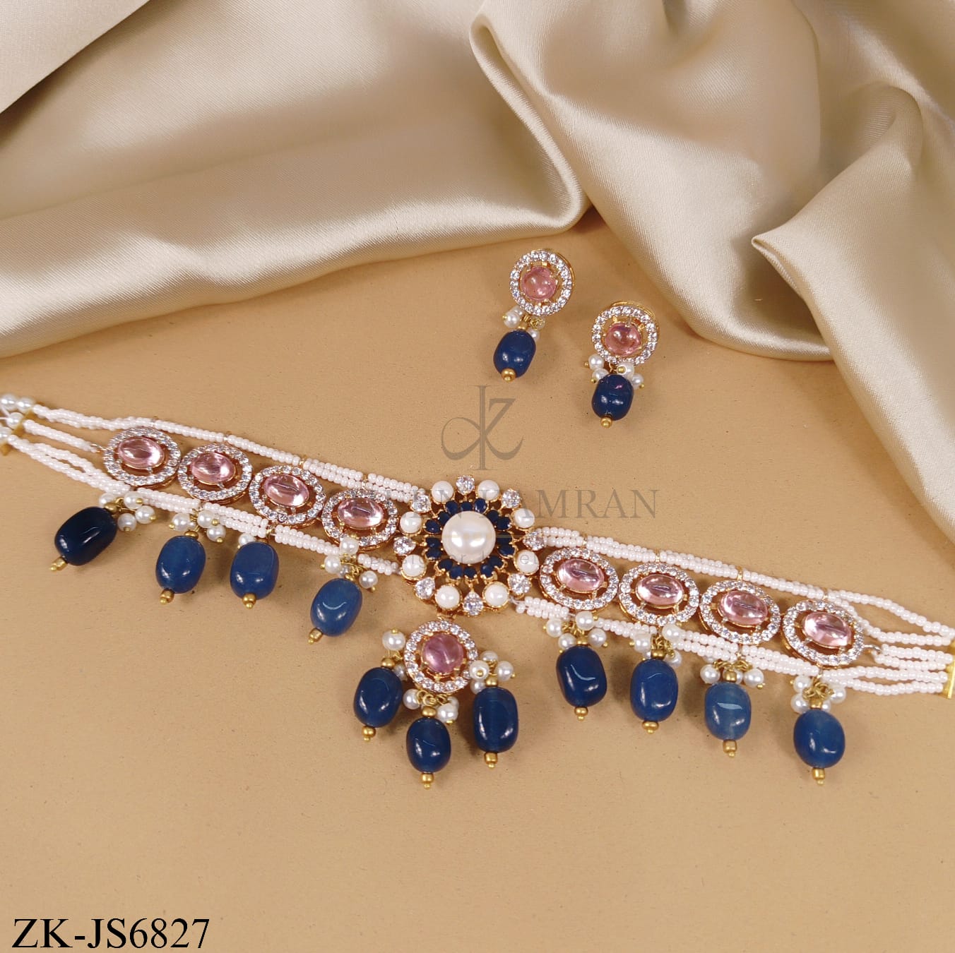 Product Overview: This elegant choker set shines with classic beauty. The design mixes pink stones with blue drops. White beads create delicate lines across the chest. A large white pearl sits in the center. The matching earrings complete the luxurious look. The gold finish adds shine to every piece. This set makes any outfit look very special.