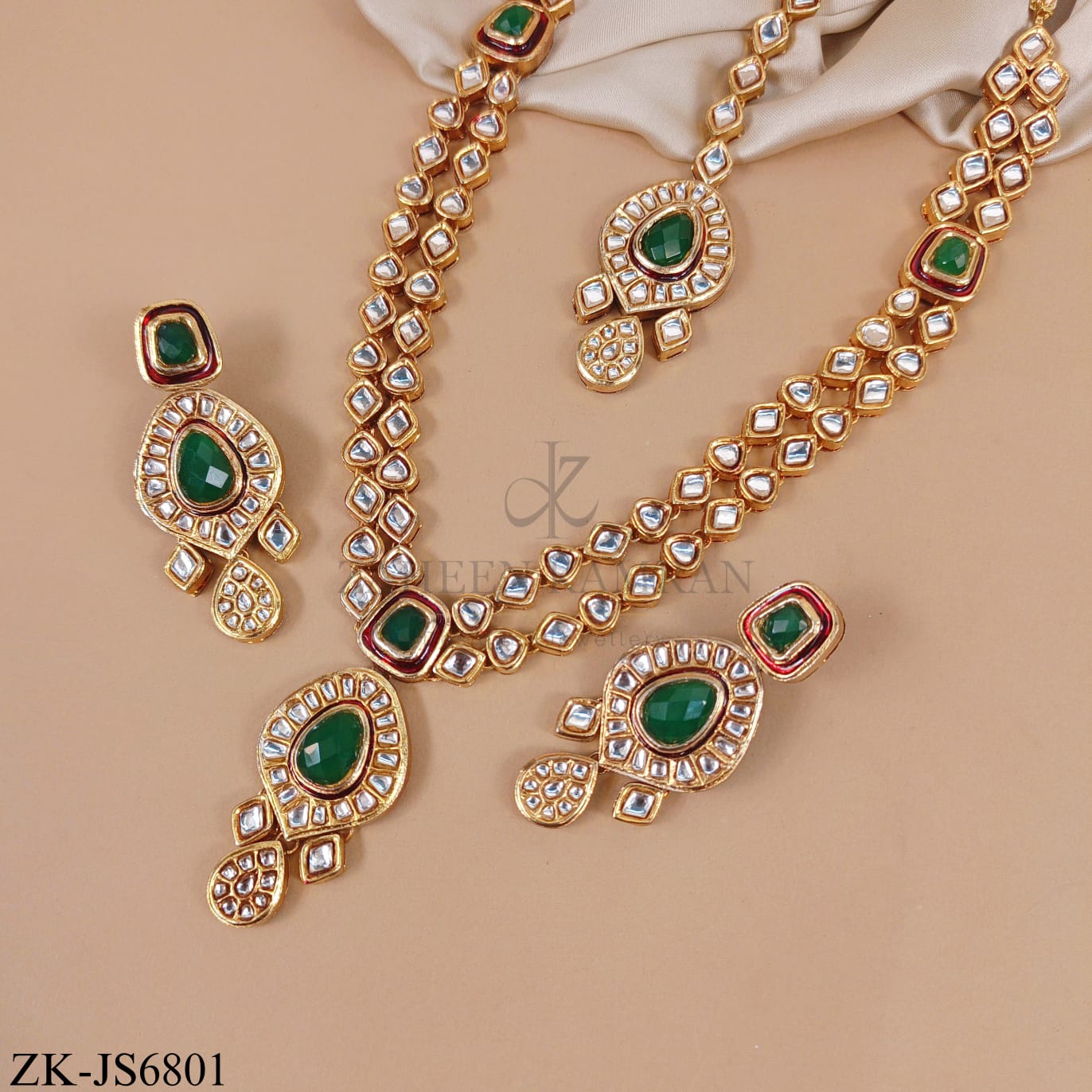 Gold-toned kundan necklace set with emerald center stones featuring matching earrings and tikka and a double-strand chain design.