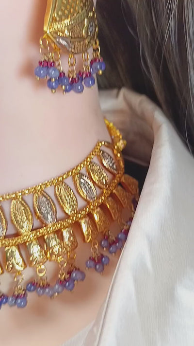 Zk Abdul Qadeer: Handcrafted 22k gold plated necklace alongside earrings studded with amethyst.