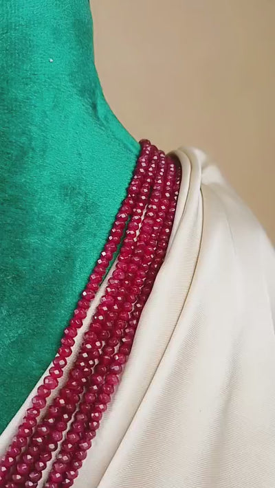 Handcrafted 22k gold plated mala alongside earrings adorned with garnet and kundan.