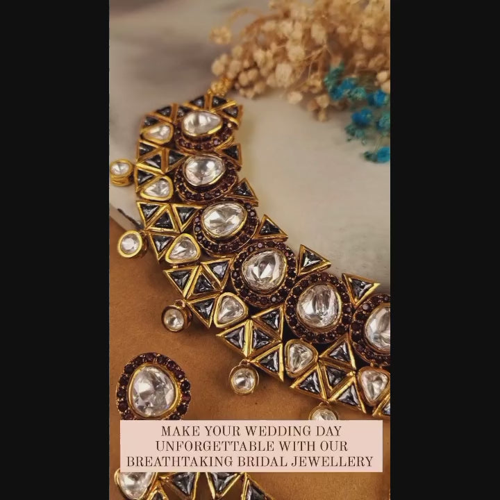 Handcrafted 22k gold plated necklace alongside earrings and tikka adorned with smoky stones and kundan.