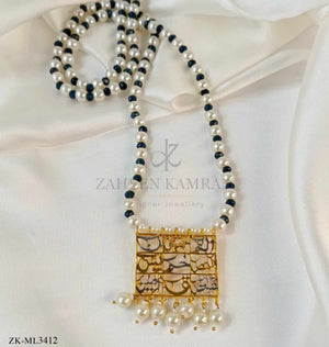 Handcrafted 22k gold plated mala studded with sapphire and pearls.