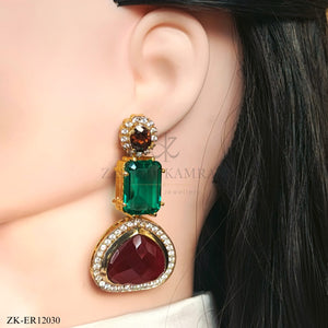 Handcrafted 22k gold plated earrings studded with garnet, emerald and zircons.