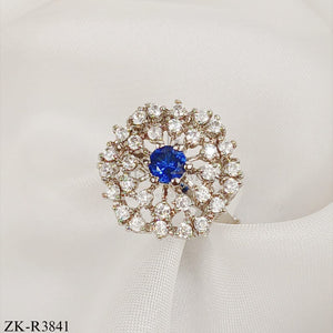A stunning silver ring featuring a sapphire at its center, surrounded by zirconia.