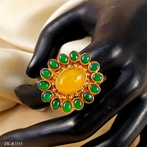 Handcrafted 22k gold plated ring studded with emerald and yellow jade.