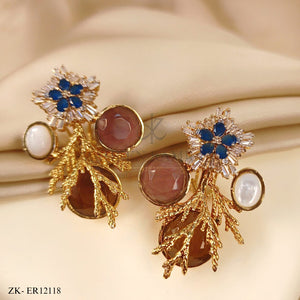 Elegant gold-tone earrings featuring a stylish combination of coffee stones, sapphire with zirconia, and white pearl drops. The layered tree-branch design adds a luxurious.