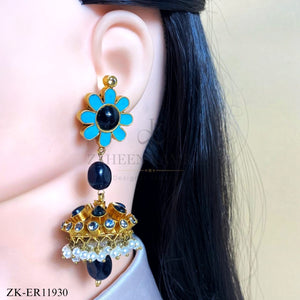 Handcrafted 22k gold plated earrings studded with black onyx, blue meena, smoky stones and pearls.