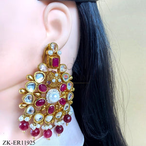 Handcrafted 22k gold plated earrings studded with kundan, garnet and pearls.