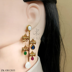 Handcrafted 22k gold plated earrings adorned with multi coloured stones.