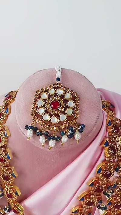 Handcrafted 22k gold plated necklace alongside earrings and tikka studded with polki, sapphire and pearls.