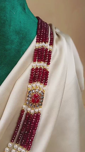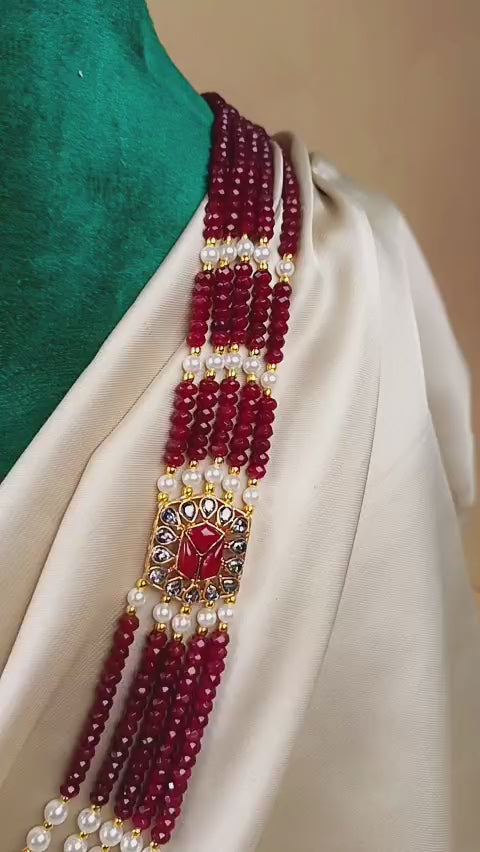 Handcrafted 22k gold plated mala adorned with garnet and pearls.