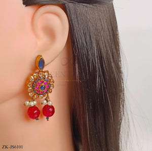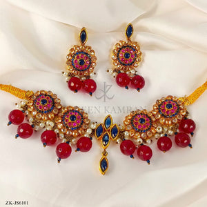 Handcrafted 22k gold plated choker, mala alongside earrings studded with ruby, sapphire, champagne and pearls.
