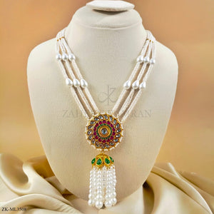 Handcrafted 22k gold plated mala studded with pink zirconia, emerald, kundan and pearls.