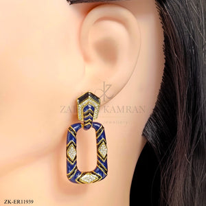 Handcrafted 22k gold plated earrings studded with blue meena and zircons.