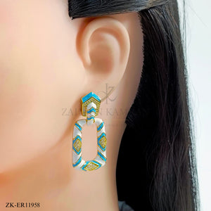 Handcrafted silver and gold plated earrings studded with zircons, white and sky meena.