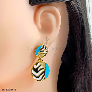 Handcrafted 22k gold plated earrings studded with zircons, sky, black and white Meena.