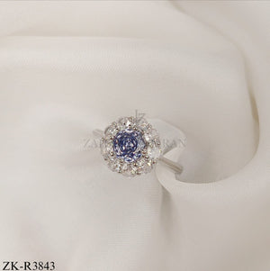 A stunning silver ring featuring amethyst its center, surrounded by zirconia.
