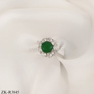A stunning silver ring featuring a emerald at its center, surrounded by zirconia.