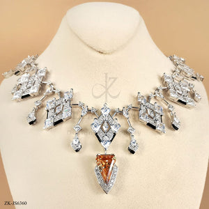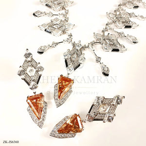 Handcrafted silver plated necklace alongside earrings studded with citrine and zircons.