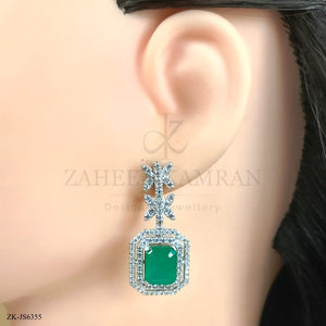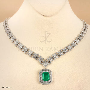 Handcrafted silver plated mala alongside earrings studded with emerald and zircons.