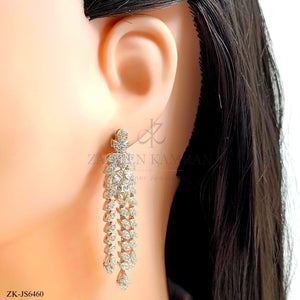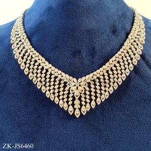 Handcrafted silver plated necklace alongside earrings studded with zircons.