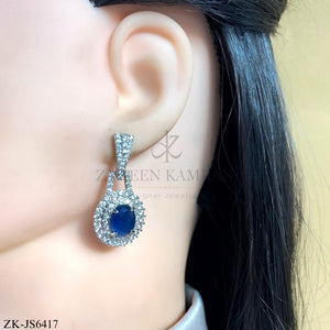 Handcrafted silver plated necklace alongside earrings studded with sapphire and zircons.