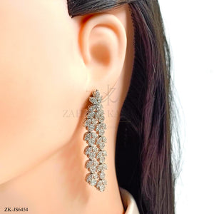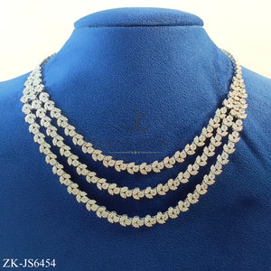 Handcrafted silver plated necklace alongside earrings studded with zircons.