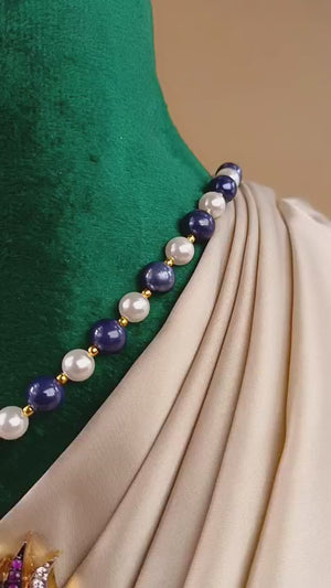 Handcrafted 22k gold plated mala adorned with ruby, sapphire and zircons.
