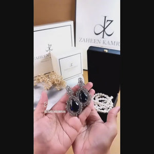 Handcrafted silver plated pendant alongside earrings adorned with sapphire and pearls.
