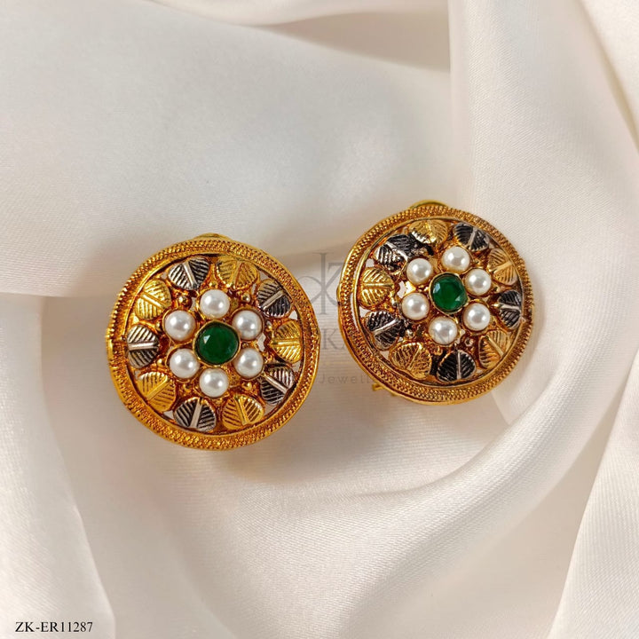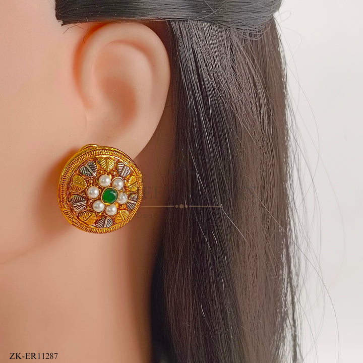 Handcrafted 22k gold plated earrings studded with emerald and pearls.